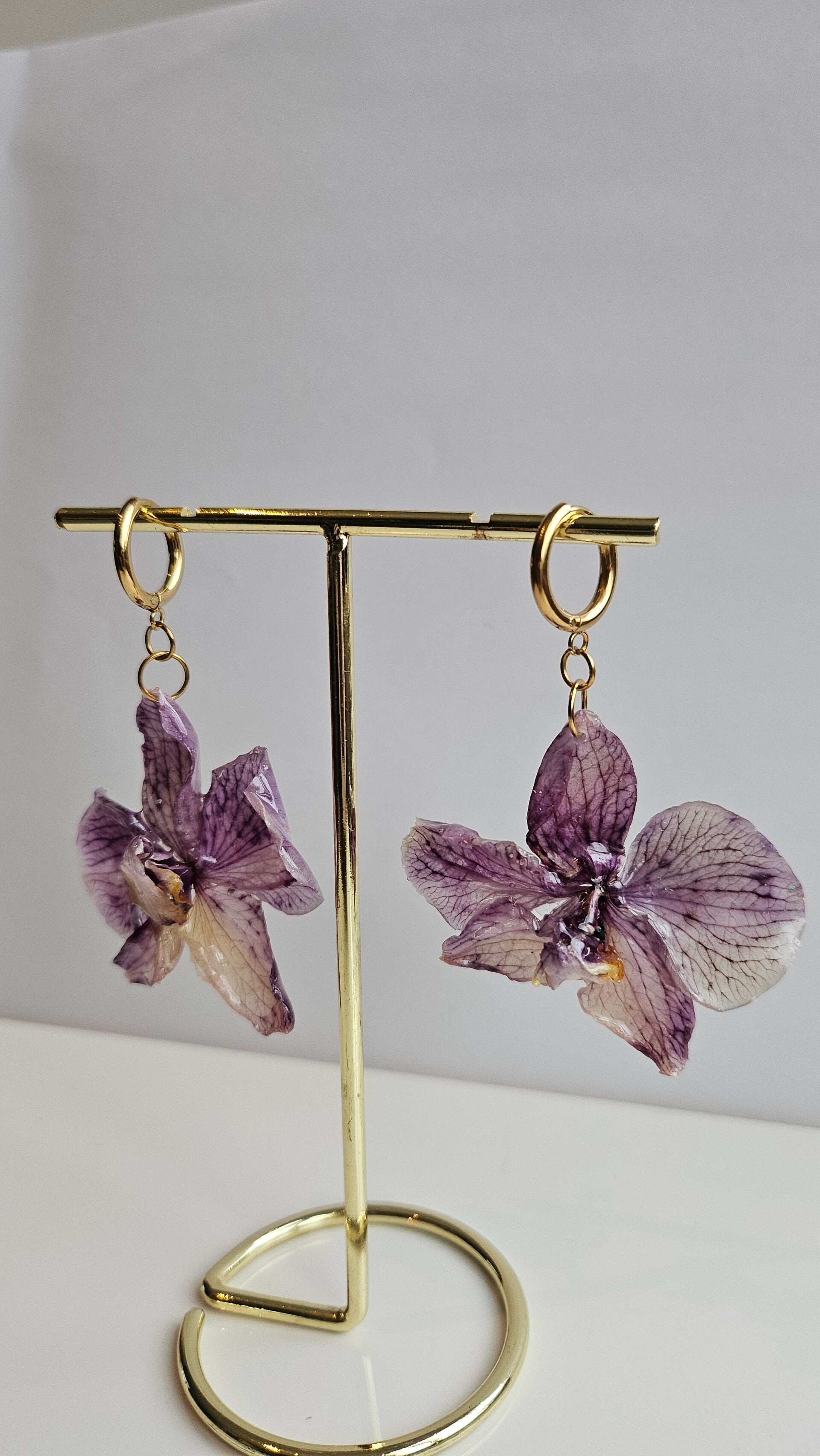 Deze prachtige oorbellen zijn gemaakt gedroogde orchideeën.